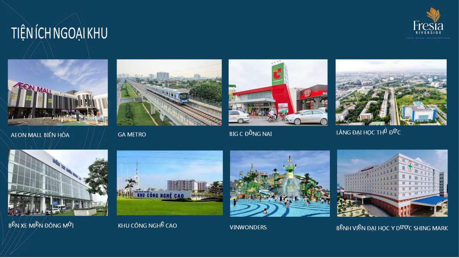 – Toạ lạc tại trung tâm thành phố Biên Hoà, đối diện AEON Mall – Fresia Riverside dễ dàng tiếp cận các trục đường huyết mạch như: Tuyến Metro số 1, Quốc lộ 1A, Xa lộ Hà Nội, Vành đai 3,… Với vị trí vừa đủ yên tĩnh để tận hưởng không gian sống bên sông, vừa đủ gần để kết nối nhanh chóng, Fresia Riverside chính là lựa chọn hoàn hảo cho cư dân hiện đại.