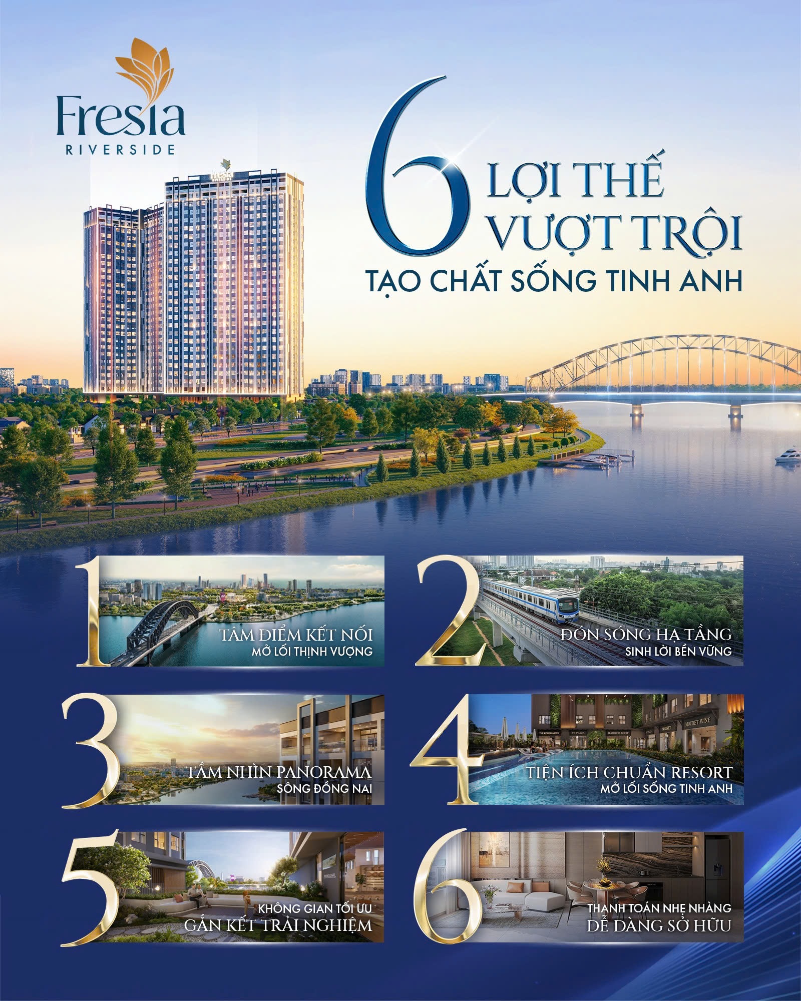 VỊ TRÍ “KIM CƯƠNG” – KẾT NỐI TP.HCM CHỈ 15 PHÚT: Fresia Riverside tọa lạc ngay trung tâm TP. Biên Hòa, chỉ cách TP.HCM 15 phút di chuyển qua tuyến Metro số 1, cư dân không chỉ thuận tiện trong việc đi làm, đi học mà còn thừa hưởng toàn bộ hệ sinh thái tiện ích cao cấp tại khu vực năng động bậc nhất phía Đông.